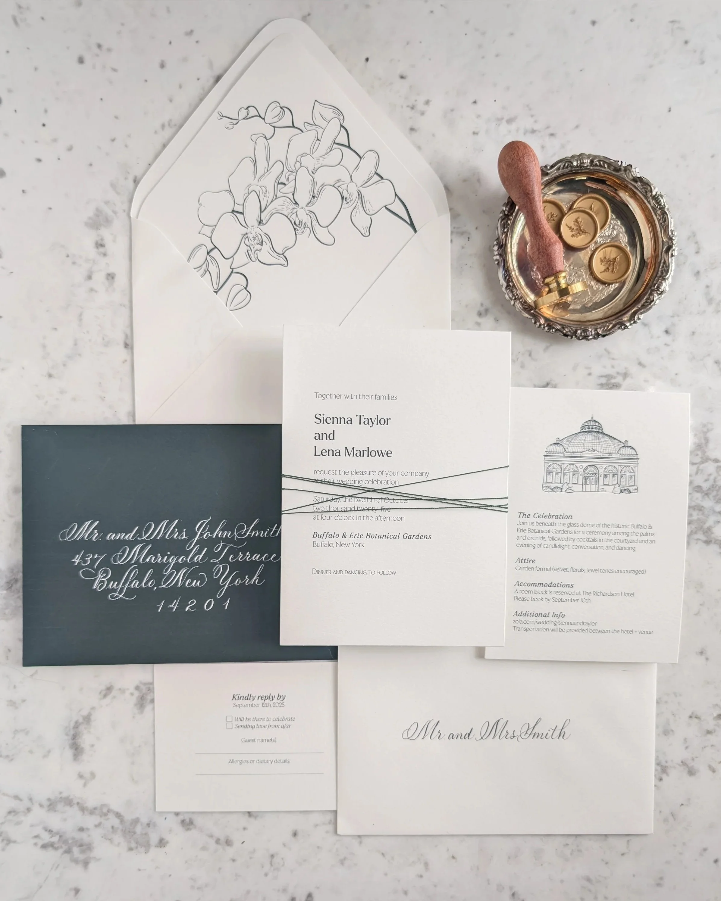 I create custom invitations, day-of paper, and live event artistry rooted in tradition, refined in execution, and designed to make an impression. Think: one artist, one streamlined process, one unforgettable suite of details.